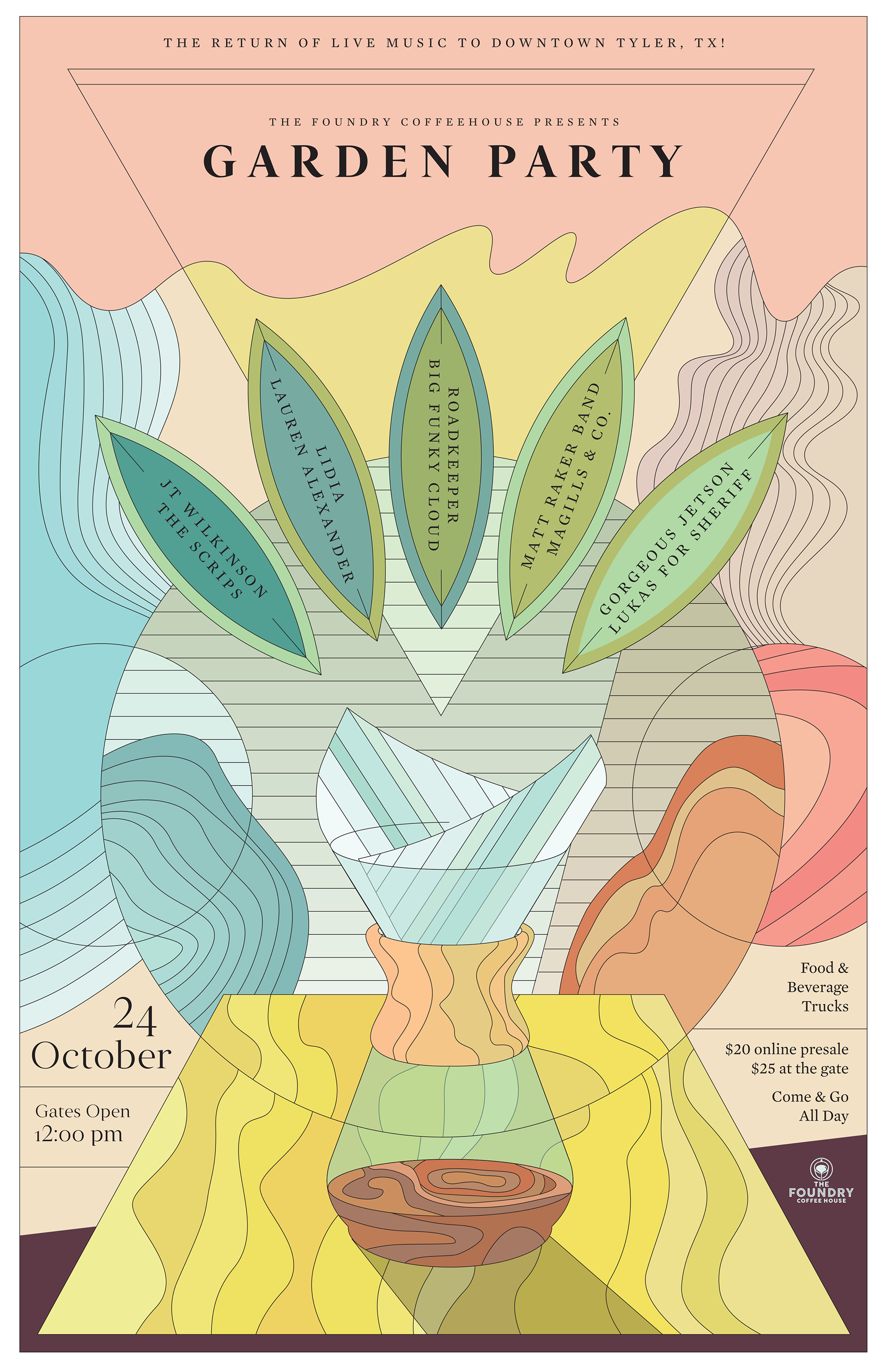 Poster design for a music + food truck fest in Tyler, Texas. Presented by The Foundry Coffeehouse in their outdoor garden. Experiments in modern psychedelic style.