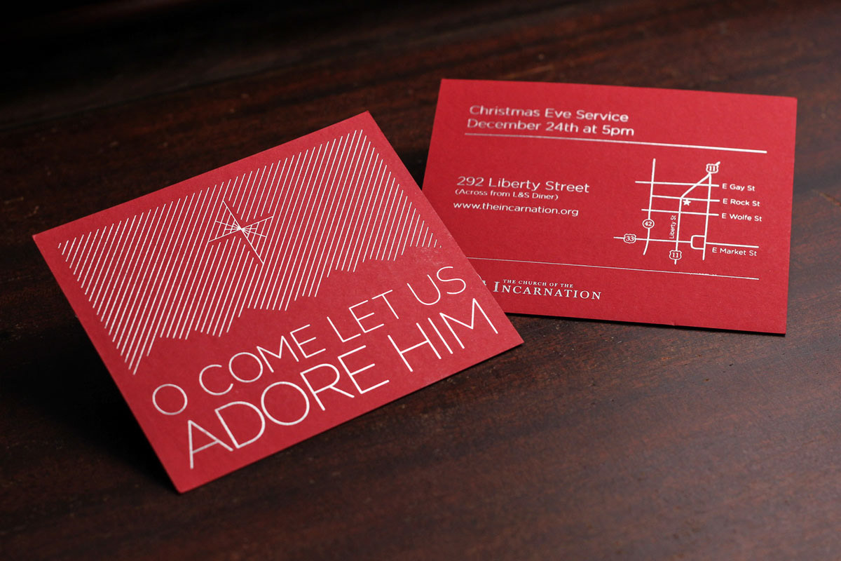 Using silver foil and red uncoated paper, I created a unique handout for a newly founded Church in Virginia. The silver on red really captures the spirit and wonder of an orthodox-based Christmas Eve service.