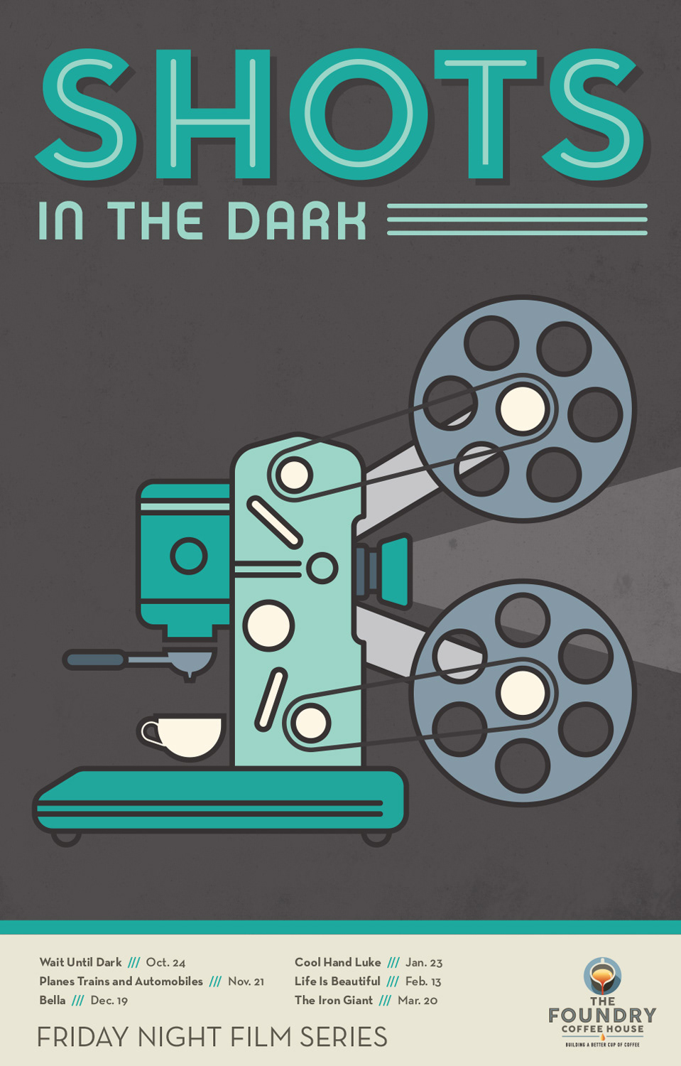 Event name and poster design for The Foundry Coffee House in Tyler, Tx. Promotes a monthly film series.