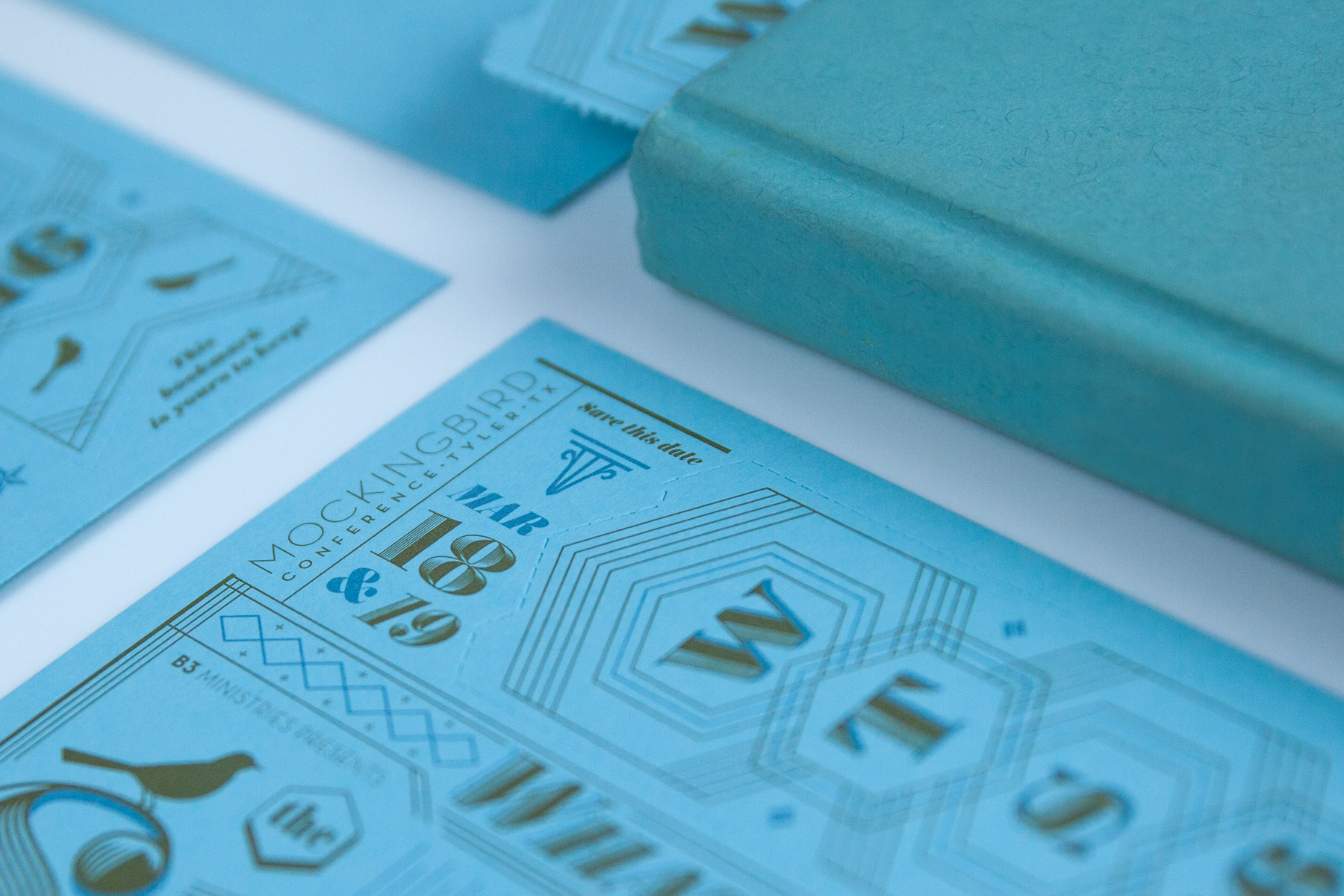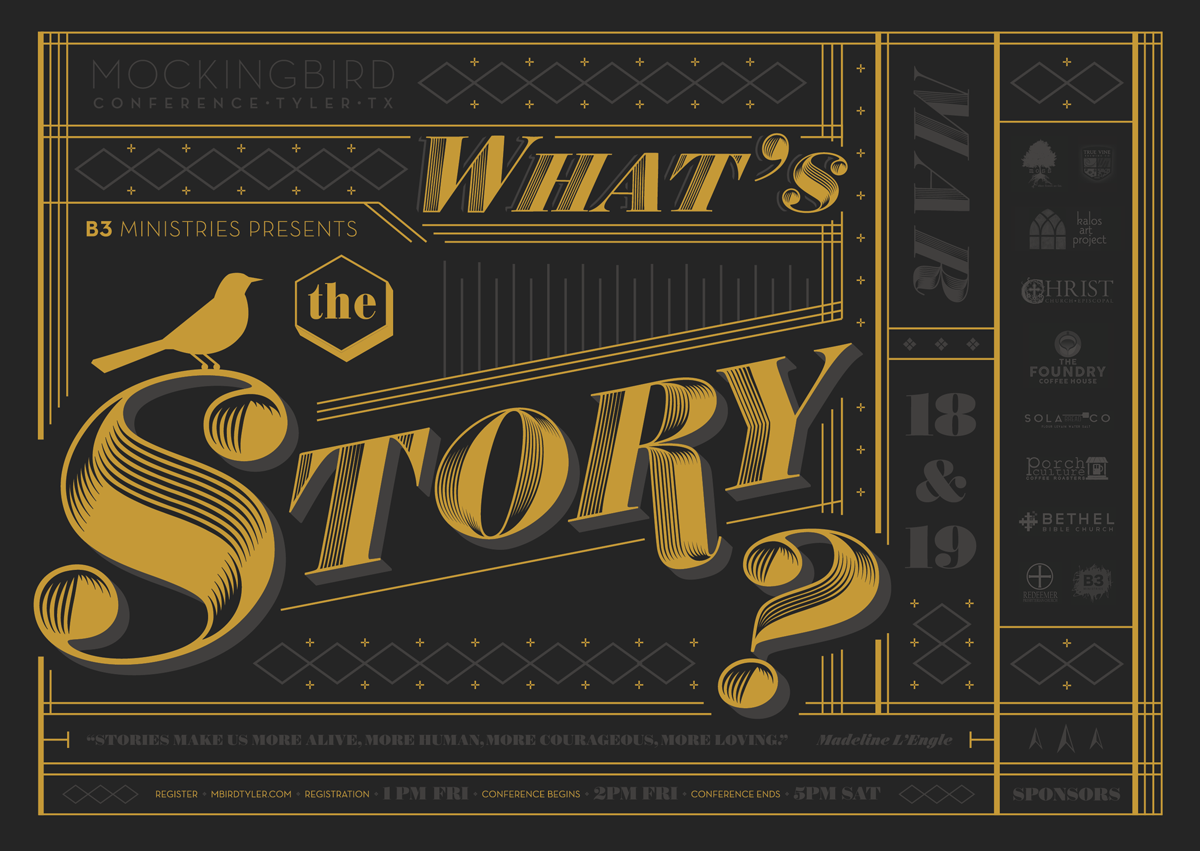 Postcard to promote a conference focused on art and culture from a Christian worldview. The overall topic for 2016 is about storytelling. I drew inspiration from old gold foil stamped hardbound books. The ink was a metallic gold. I created a postcard that perforated into a bookmark.